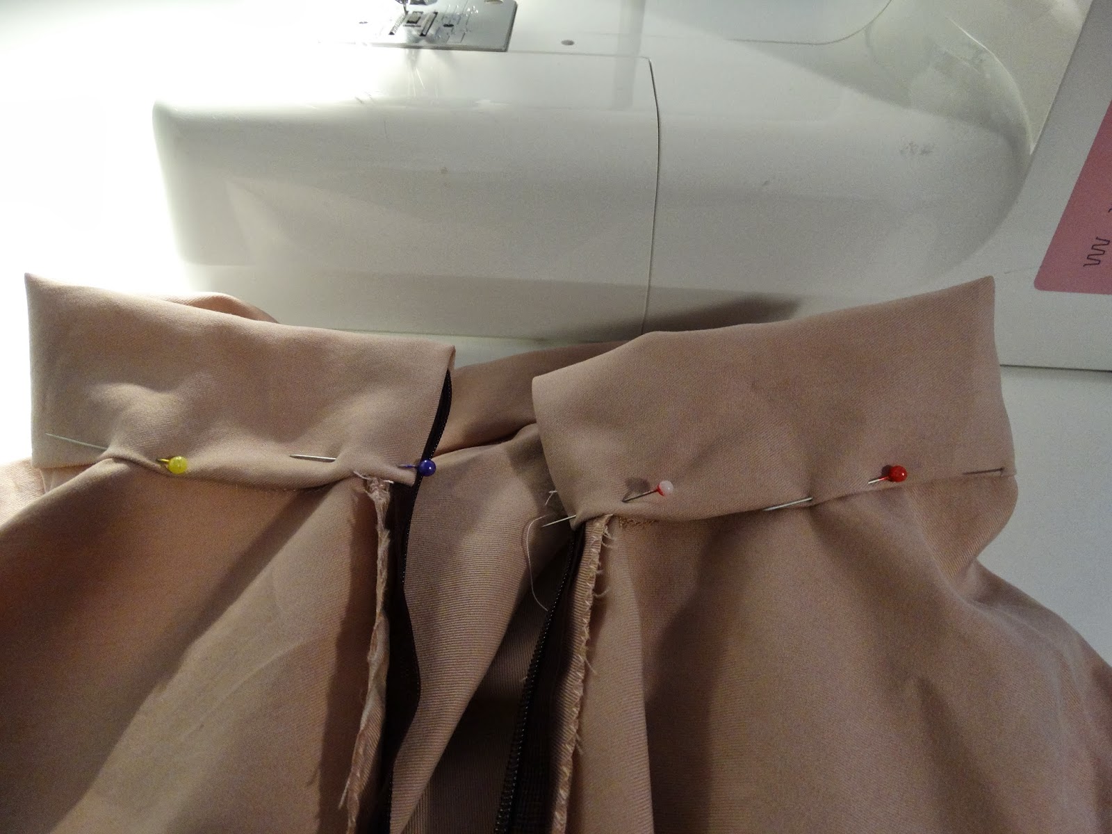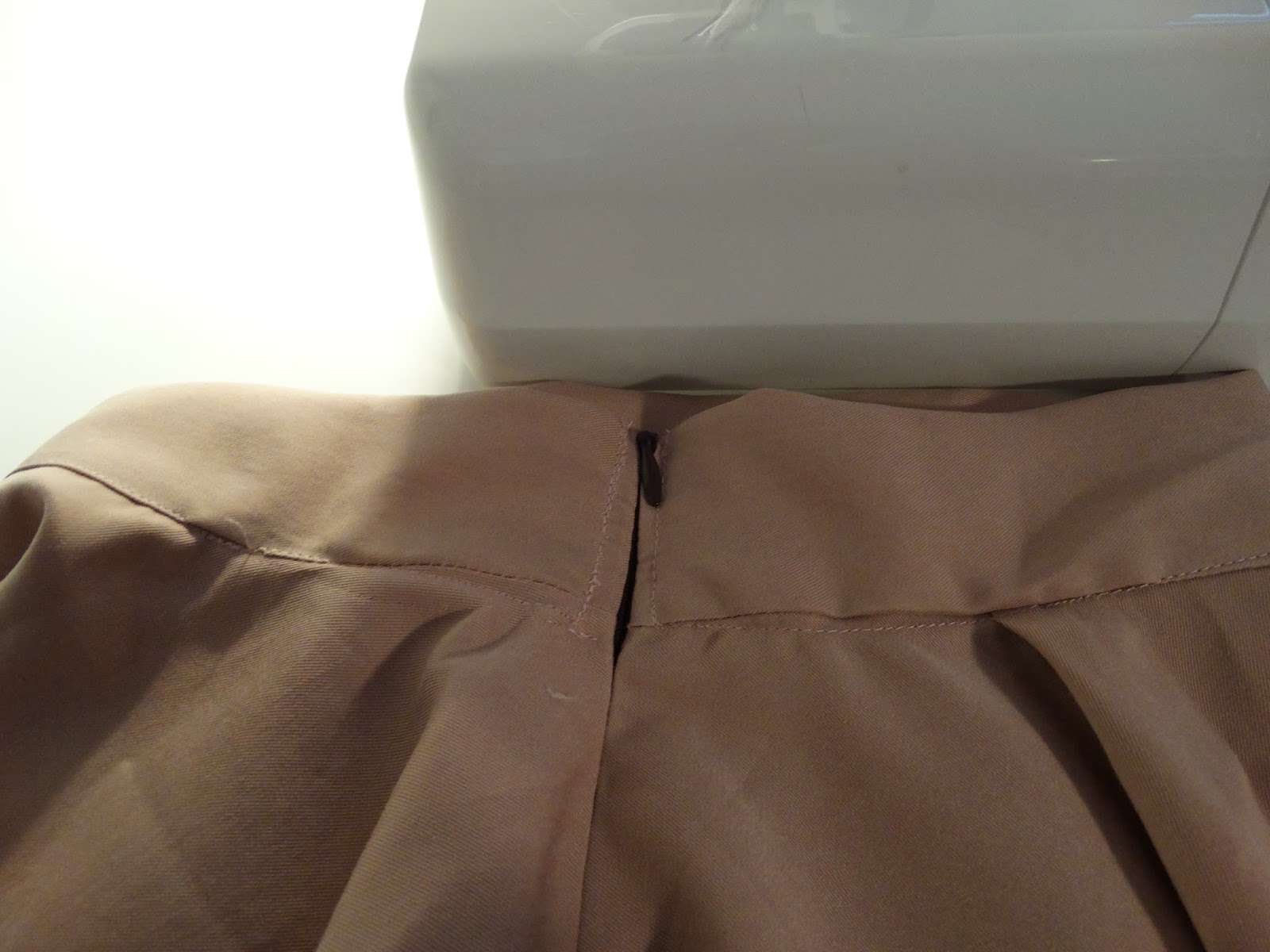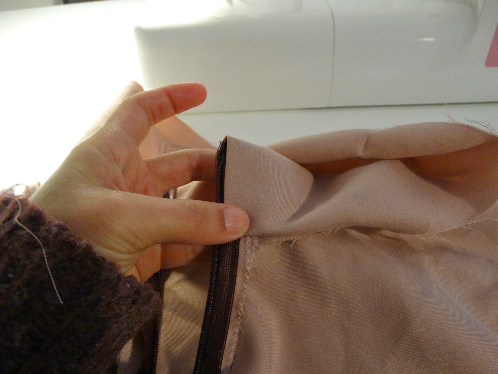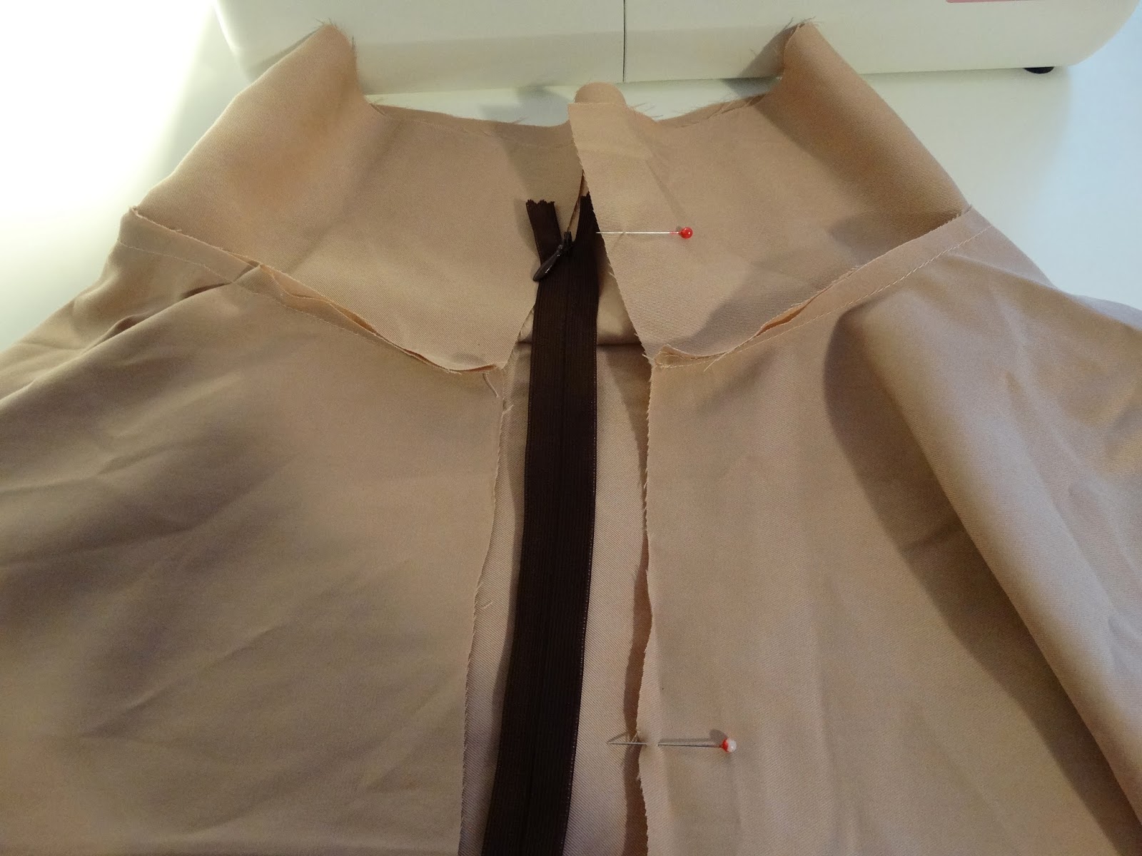 Fixar com alfinetes a saia em baixo até ao ponto onde o fecho vai fechar.