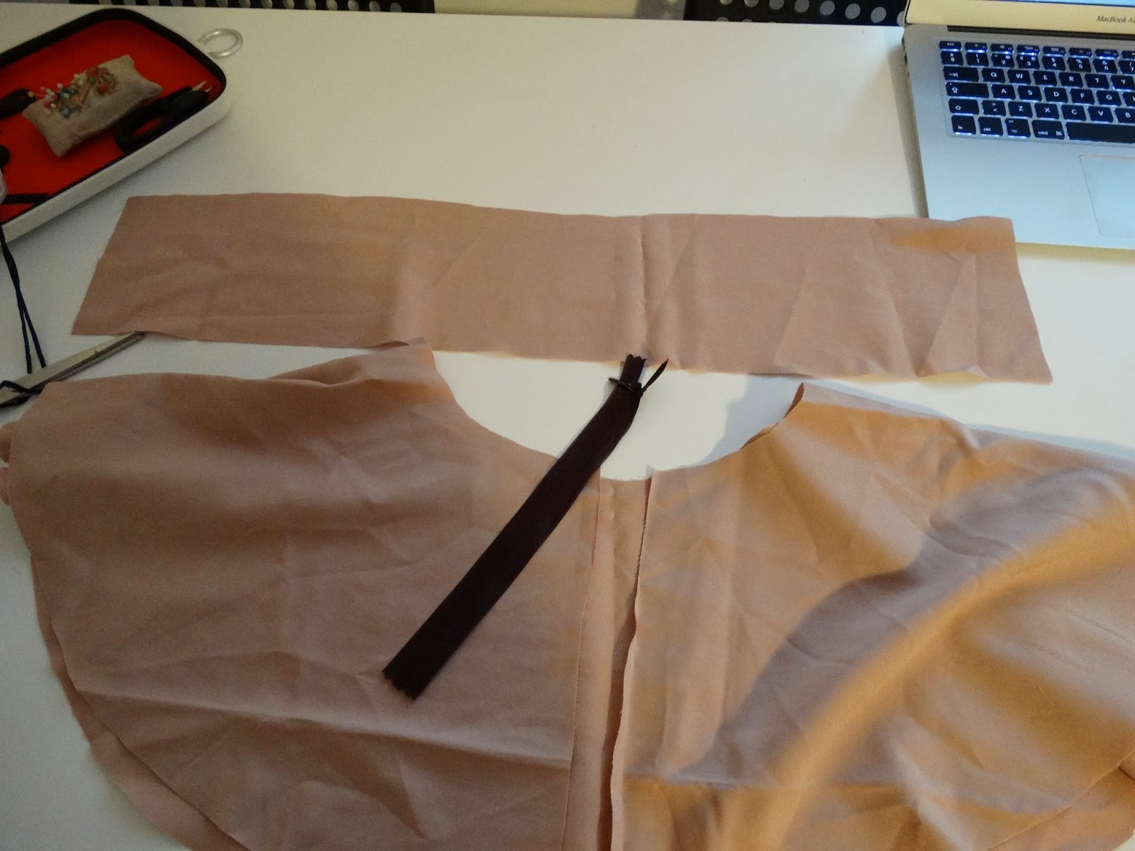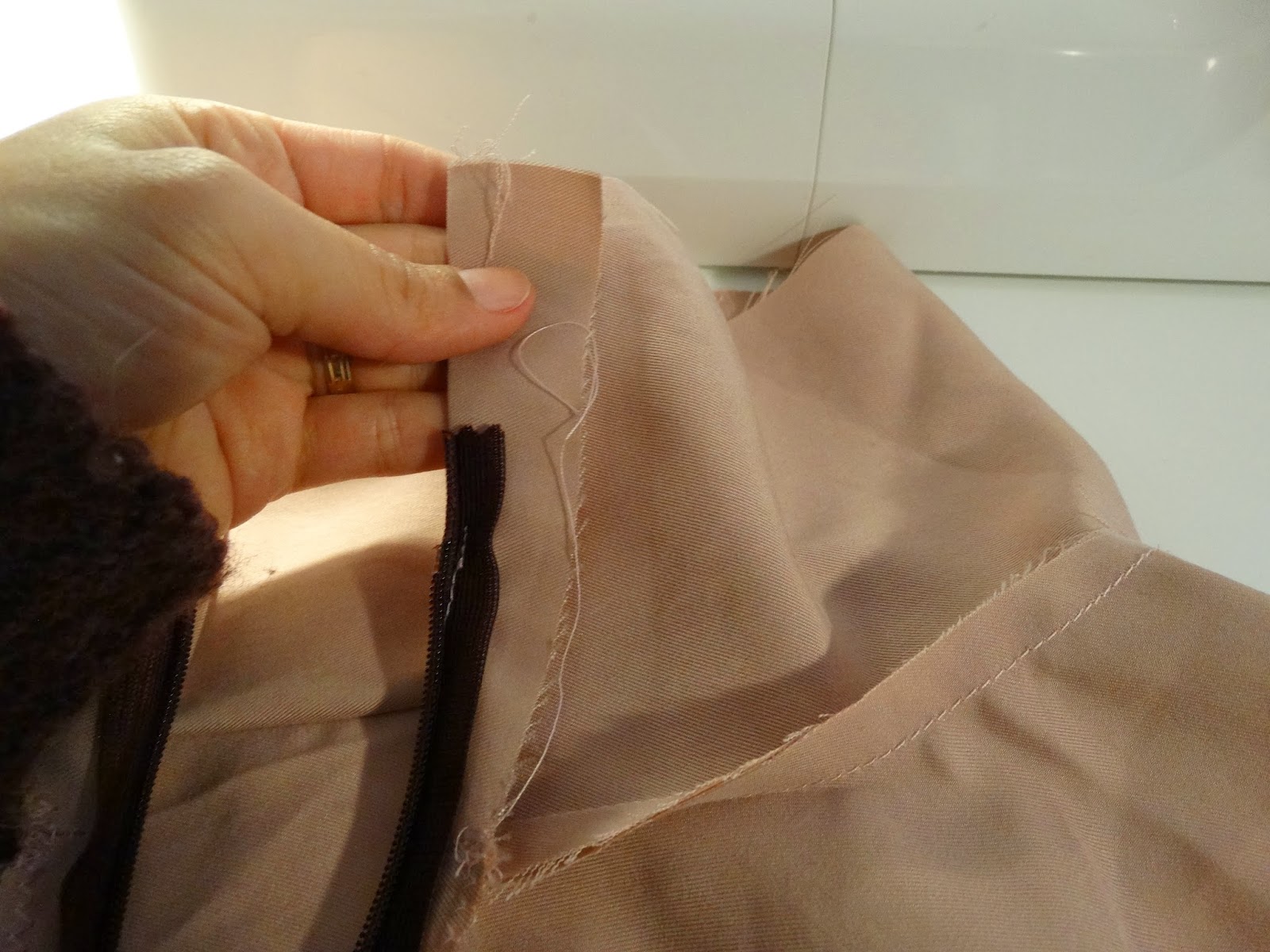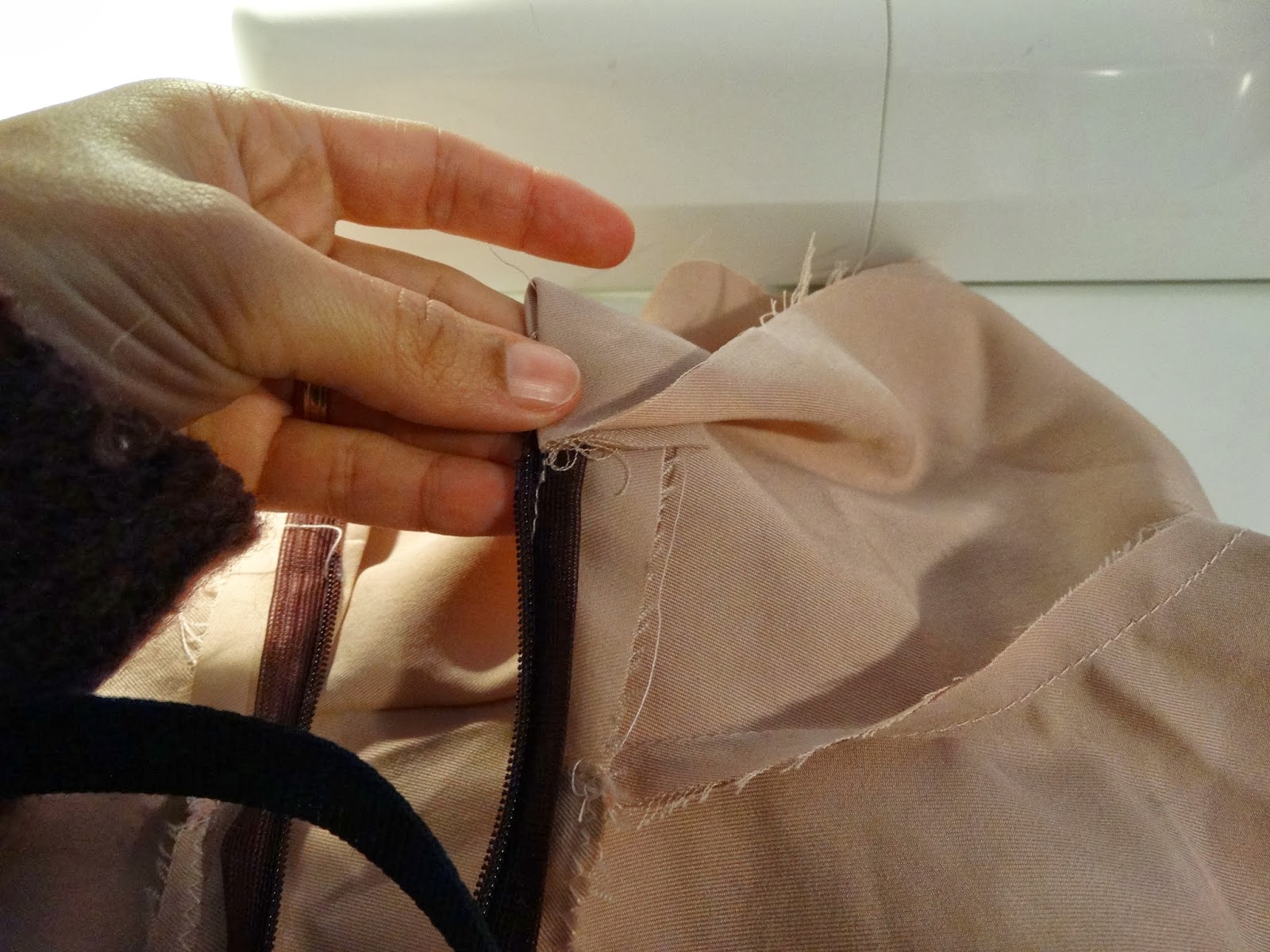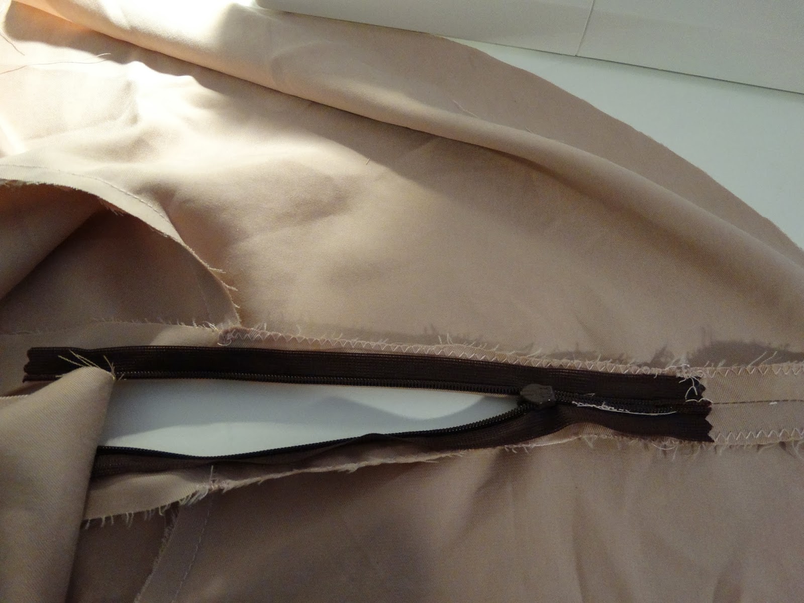 Fixar com alfinetes a saia em baixo até ao ponto onde o fecho vai fechar.